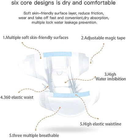 المواد: لب الخشب غير المنسوج، شريط SAP Magic، غطاء خلفي غير منسوج، خصر مطاطي (للإناث) تحذير: لتجنب خطر الاختناق، احفظ جميع الأكياس البلاستيكية بعيدًا عن الأطفال والحيوانات. لا تستخدمها في أسرة الأطفال أو الأسِرَّة أو العربات أو حظائر اللعب. هذه الحقيبة ليست لعبة.