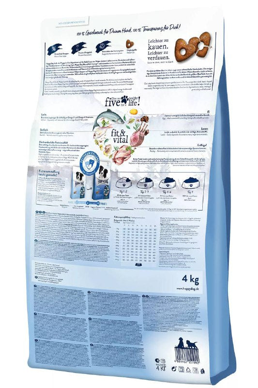 بروتين الدواجن* (18%)، دقيق الذرة، دقيق الأرز، وجبة اللحوم، دهن الدواجن، وجبة السمك (5%، منها 50% وجبة سمك السلمون)، الذرة، بروتين لحم الضأن* (4%)، زيت زهرة عباد الشمس، لب البنجر* (منزوع السكر)، كبد محلل، ثفل التفاح*، السليلوز، زيت الكانولا، كلوريد البوتاسيوم، الخميرة*، كلوريد الصوديوم، بيضة كاملة مجففة (0.2%)، أعشاب بحرية*، بذر الكتان (0.16%)، قشور سيلليوم، لحم بلح البحر* (0.05%)، يوكا شيديجيرا*، الخميرة* (مستخلص)، شوك الحليب، الخرشوف، الهندباء، الزنجبيل (0.013%)، أوراق البتولا، نبات القراص، البابونج، الكزبرة، إكليل الجبل، المريمية، جذر عرق السوس، الزعتر، (إجمالي الأعشاب المجففة: 0.16%)؛ *) المجففة.