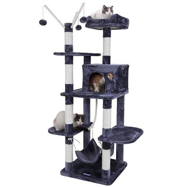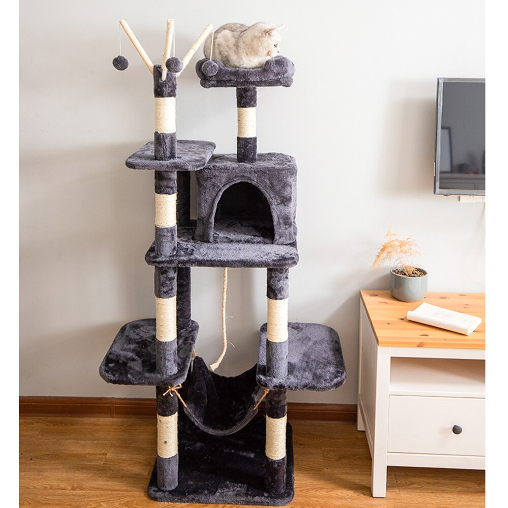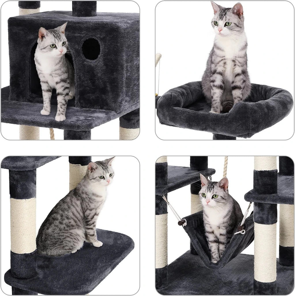 شجرة القطط هي الإكسسوار المنزلي المثالي لقطتك أو قططك، والتي يمكن أن تكون أيضًا إضافة تصميمية فريدة لغرفة المعيشة. على منصات المشاهدة ذات الحشو السميك، ستتمتع قططك برؤية مثالية لكل ما يحدث. يتم وضع منصات الراحة والأسرّة والأقفاص على مستويات ارتفاع مختلفة، لذا فإن هذه الأشجار مثالية للقطط الصغيرة والقطط الأكبر سنًا. يتم لف الأنابيب الورقية بحبل السيزال، مما يمنع القطط من شحذ مخالبها على أثاثك. الشجرة سهلة التجميع للغاية وهناك العديد من خيارات الألوان للاختيار من بينها. هذا ملحق أساسي لجميع مربي القطط.