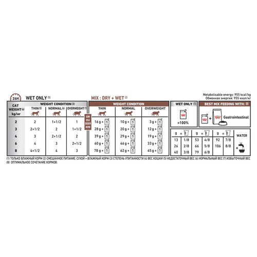 ROYAL CANIN® گەدە و ڕیخۆڵە خۆراکێکی وردە بۆ ئەو پشیلانەی کە حاڵەتی توند و/یان درێژخایەنی گەدە و ڕیخۆڵەیان هەیە. لە مێژوودا زۆربەی حاڵەتەکانی نەخۆشی گەدە و ڕیخۆڵە بە لانیکەم ٢٤-٤٨ کاتژمێر پشوودانی گەدە و ڕیخۆڵە چارەسەر دەکرا. بەڵام لێکۆڵینەوەکان دەریانخستووە کە کەمی خۆراک دەبێتە هۆی کاریگەری زیانبەخش لەسەر ڕیخۆڵە ڕیخۆڵەکان. پشتگیری خۆراکی گونجاو دەتوانێت کاریگەری قووڵی لەسەر چاکبوونەوەی کورتخایەن و بەڕێوەبردنی نەخۆشی درێژخایەنی نەخۆشەکان هەبێت. پێشنیار دەکرێت لە حاڵەتی: سکچوونی توند و درێژخایەن، هەوکردنی گەدە، نەخۆشی هەوکردنی ڕیخۆڵە (IBD)، هەوکردنی قۆڵۆن، گەشەکردنی زۆری بەکتریاکانی ڕیخۆڵە باریکە (SIBO)، خراپ هەرسکردن/ کەم مژینی، ناڕێکی لە خواردن، دووبارە خۆراکدانەوە دوای نەشتەرگەری. پێشنیار ناکرێت لە حاڵەتی: لیمفەنجیێکتاسیا، نەخۆشی ڕیخۆڵەی دەردراو. ئەم ڕێجیمە تەواو و هاوسەنگە و دەتوانرێت بۆ ماوەیەکی درێژ خۆراک بدرێت. پێویستە هەر ٦ مانگ جارێک پشکنینی تەواوی تەندروستی لەلایەن پزیشکی ڤێتێرنەریەوە ئەنجام بدرێت.