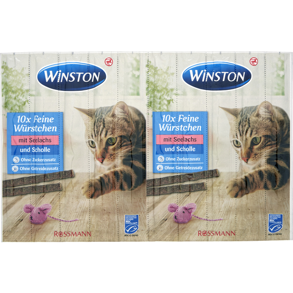 بە باشترین پێکهاتەکان و بە خۆشەویستییەکی زۆر دروستکراوە: سۆسیسێکی ورد بۆ پشیلەکەت - لەگەڵ پۆلۆک و پلاسی بڕوانامەی MSC. بەم خواردنە کەم و بە تامە دەتوانیت لە نێوان ژەمەکاندا بە ئاسانی سۆز و خۆشەویستیت پیشانی کەسە خۆشەویستەکەت بدەیت. سۆسیسەکانی وینستن فاین بە تاک دەپێچرێنەوە و بۆیە بە تایبەتی تا دوا گازگرتن بە تام و چێژە. بەتەواوی بەبێ زیادکردنی شەکر و ڕەنگکردن. کوالیتی لە دەرەوەی قەناعەت. بۆ خۆشەویستی وینستن.