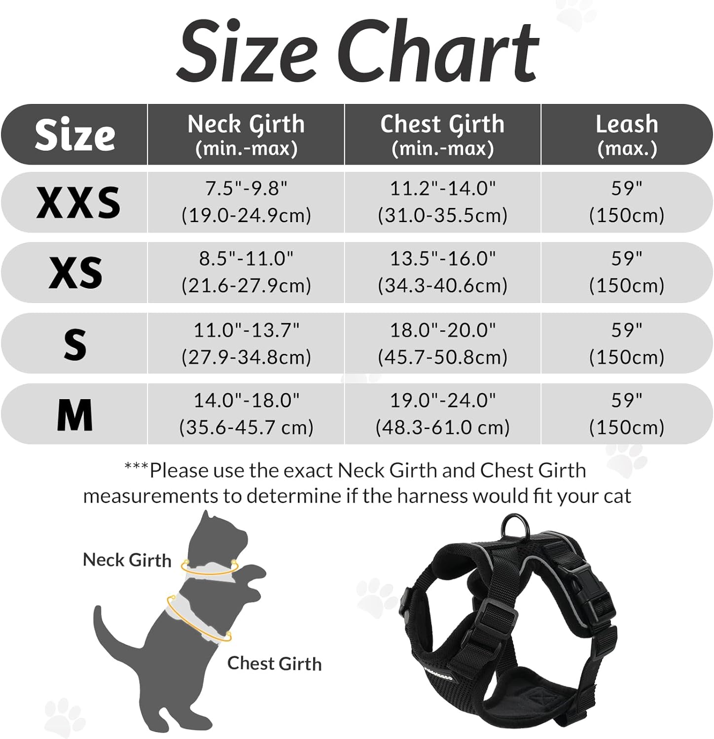 - Cat Harness with Leash, Fits Average Cats: Size measuring:Neck Girth: 8.5 -11 Inches, Chest Girth: 13.5 - 16 Inches. Please measure your cat carefully and refer to the size chart before order. (Tips: Your cat's head circumference should be at least 10 inches or your cat may slip out.) Package includes: 1x Small Cat Walking Vest and 1x Walking Nylon Leash (150cm)