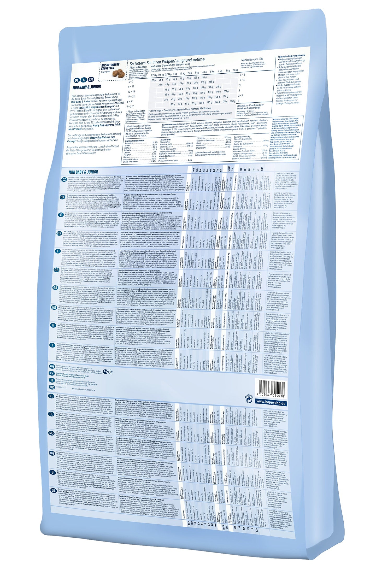 Happy Dog Mini Baby & Junior is a specially balanced complete food for puppies from the first month. It’s the perfect food for gentle, problem-free feeding of puppies of small breeds, even sensitive ones, up to 10kg adult weight. The gluten-free formulation offers a balanced range of five specially selected high-quality animal proteins – well-tolerated lamb, easily digestible poultry, hearty beef, nourishing fish and quality egg protein look after balanced growth and optimal development. Valuable New Zealand mussels contribute to the optimal development of your puppy’s locomotor system. Calcium and vitamin D3 play a large part in developing body strength and healthy bones. Omega 3 and Omega 6 fatty acids from fish and linseeds give a glossy coat and healthy skin. In addition, linseeds combined with a complex of vital elements from special yeasts, B vitamins, antioxidants and herbs support the gastrointestinal system and tract.