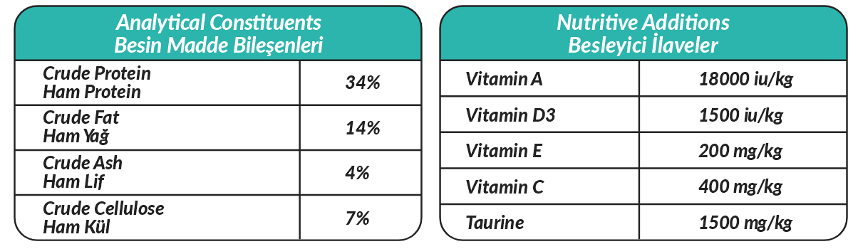 Hydrolyzed Chicken Protein, Rice, Corn, Chicken Fat, Psyllium Fiber, Sugar Cane Fiber, Sugar Beet, Liver Flavor, Alltech Food Supplements (Mannan Oligosaccarids, Yucca Schidigera, Mycotoxin Binder, Glutamic Asid, Arginine, Nucleotides, Amino acids, Organik Selenium, Prebiotics, Prebiotics), Vitamins and Minerals, DL-Methionine, Xylo-Oligosaccharide, Brewer’s Yeast, Flaxseed,Salt, L-Carnitine, Preservatives - Antioxidants.
