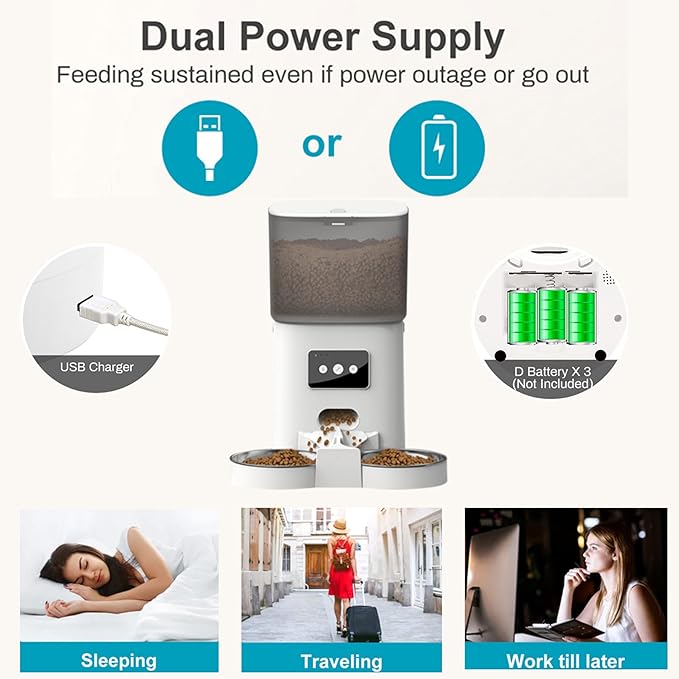 - 【مصدر طاقة مزدوج】يتم تشغيل وحدة تغذية القطط الأوتوماتيكية بواسطة محول طاقة أو بطارية. حتى إذا انقطع مصدر الطاقة بشكل غير متوقع أو انفصل المحول فجأة عن مصدر الطاقة، فلا يزال بإمكانها استخدام البطاريات لمواصلة العمل. (البطاريات غير متضمنة)