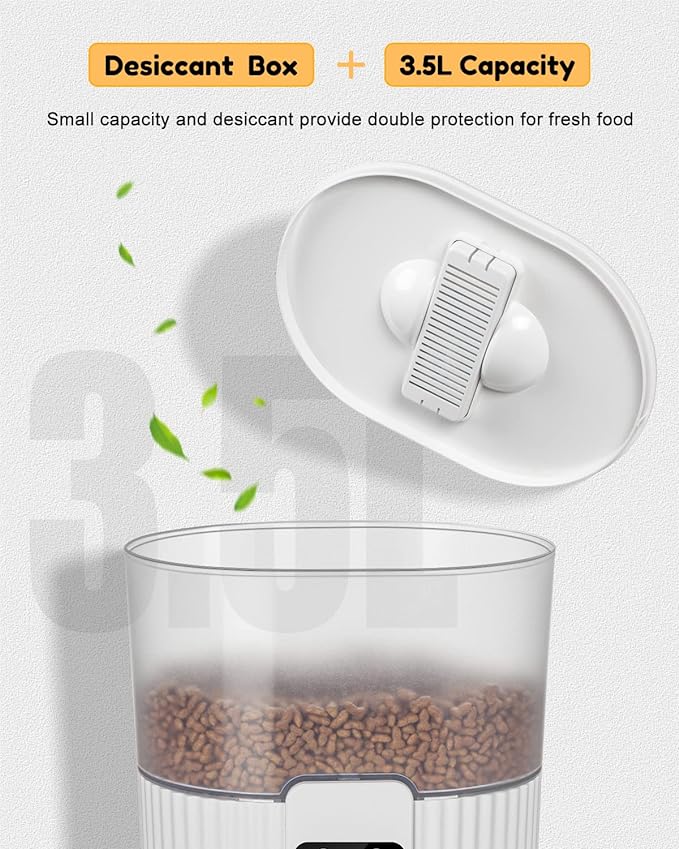 - 【حافظ على الطعام طازجًا】3.5 لتر + مجفف. لا توجد طريقة للحفاظ على الطعام طازجًا أكثر من الطعام الجديد. لذا فإن خزان الطعام الصغير السعة 3.5 لتر لا يترك الطعام ينفد بسرعة ولا يخزنه لفترة طويلة. ويأتي مع حقيبة تجفيف مدمجة. ويمكنك مراقبة مستوى الطعام بسهولة من خلال خزان الطعام الشفاف وتجديد الطعام في الوقت المناسب. لا حاجة لفتح الغطاء للتحقق.