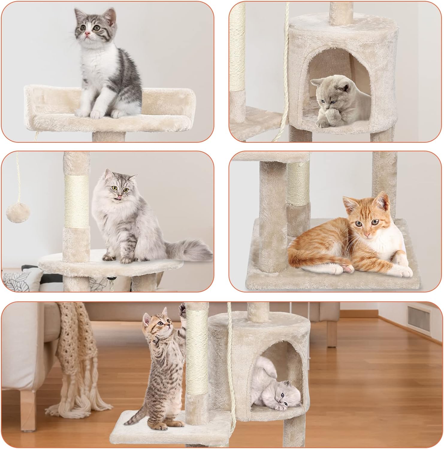 بيت قطط متعدد الطبقات: مزود بمنصات عرض مبطنة وكهف قطط واسع ولعبة قابلة للتبديل من قطعتين. بفضل التصميم المريح، يمكن لقططك القفز واللعب على أي مستوى من برج الخدش. مساحة أرضية واسعة لقططك للانتشار بحرية.