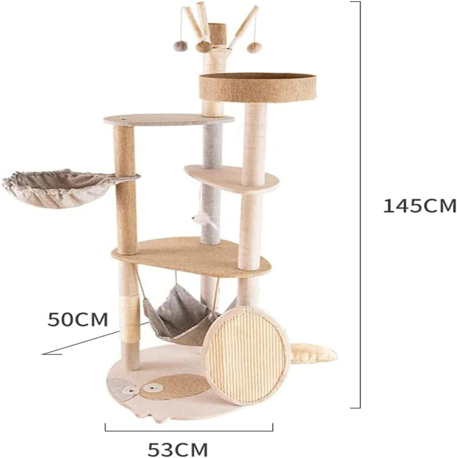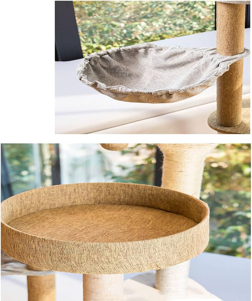 حبل السيزال الطبيعي والفراء الصناعي السميك: أعمدة الخدش مغطاة بحبل السيزال الطبيعي، وهي مثالية لقططك لشحذ أقدامها، وهي حماية جيدة لأثاثك. جميع الإطارات مُصممة بفراء صناعي للحفاظ على دفء قططك وراحتها.