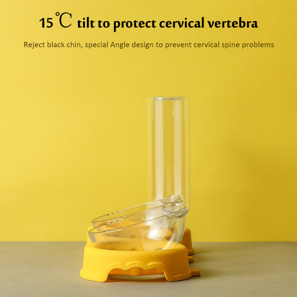 - 15° Tilt Design Unique snap on design can adjust the double cat bowl to 15° to protect the pet's cervical spine. The 360 rotating bowl provides more space for pets to eat in different directions. Perfect for cats and dogs