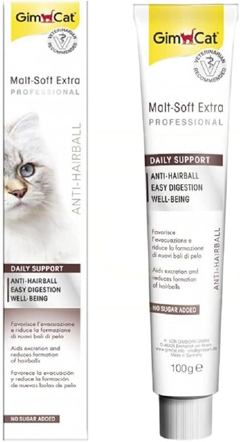 - يحتوي GimCat Malt Soft Extra على شعير طبيعي ولذيذ وزيت نباتي. عند دمجه مع الألياف الغذائية، يدعم Malt Soft Extra نقل التغذية بالإضافة إلى المرور الطبيعي للشعر المبتلع والمكونات غير القابلة للهضم.
