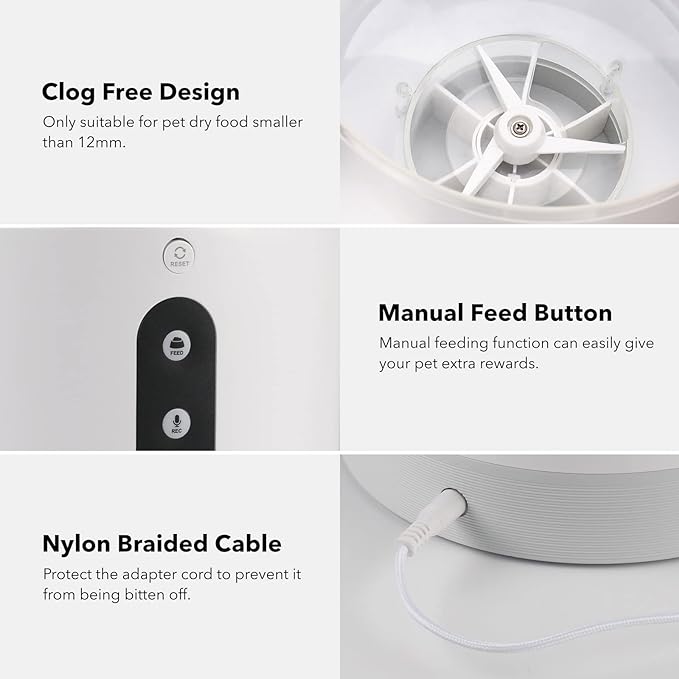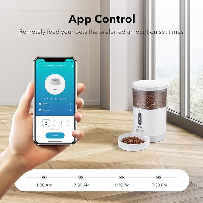 - تغذية مرنة في الوقت المناسب: تتيح لك وحدة التغذية الذكية للحيوانات الأليفة جدولة وإدارة أوقات التغذية وأحجام الحصص لحيواناتك الأليفة. يمكن التحكم في وحدات التغذية الذكية للحيوانات الأليفة هذه على الهواتف الذكية الخاصة بك حتى تتمكن من إطعام حيوانك الأليف أثناء غيابك. من الممكن أيضًا توزيع حصة واحدة يدويًا في أي وقت بالضغط على الزر الموجود على جسم الموزع.