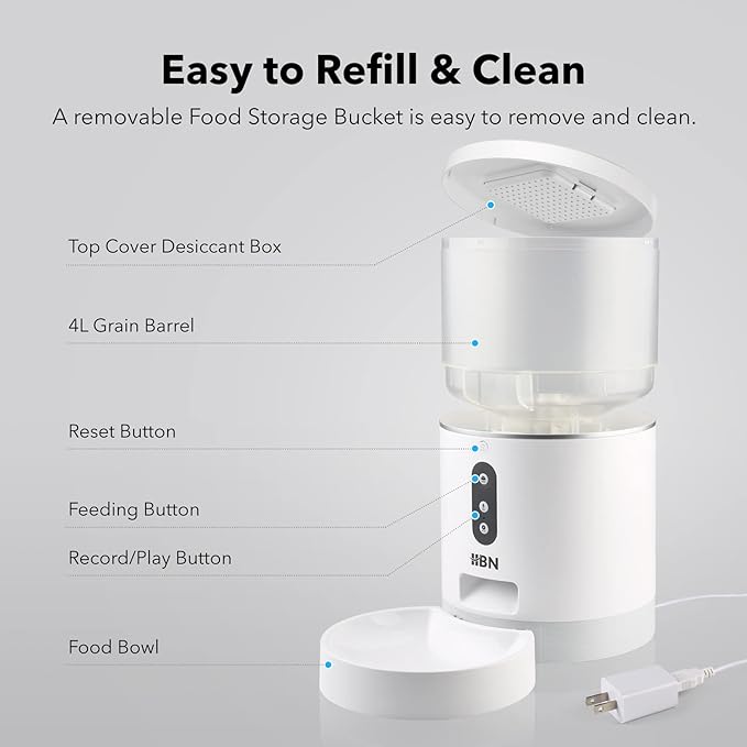 - حاوية طعام قابلة للإزالة بسعة 4 لتر: تم تجهيز وحدة تغذية الحيوانات الأليفة الذكية هذه بحاوية طعام قابلة للإزالة بسعة 4 لتر. مناسبة لأي طعام جاف بحجم حبوب يتراوح من 2 إلى 10 مم. ما يصل إلى 30 وجبة، مع 1 إلى 10 حصص لكل وجبة، وكل حصة تزن حوالي 10 جرام.