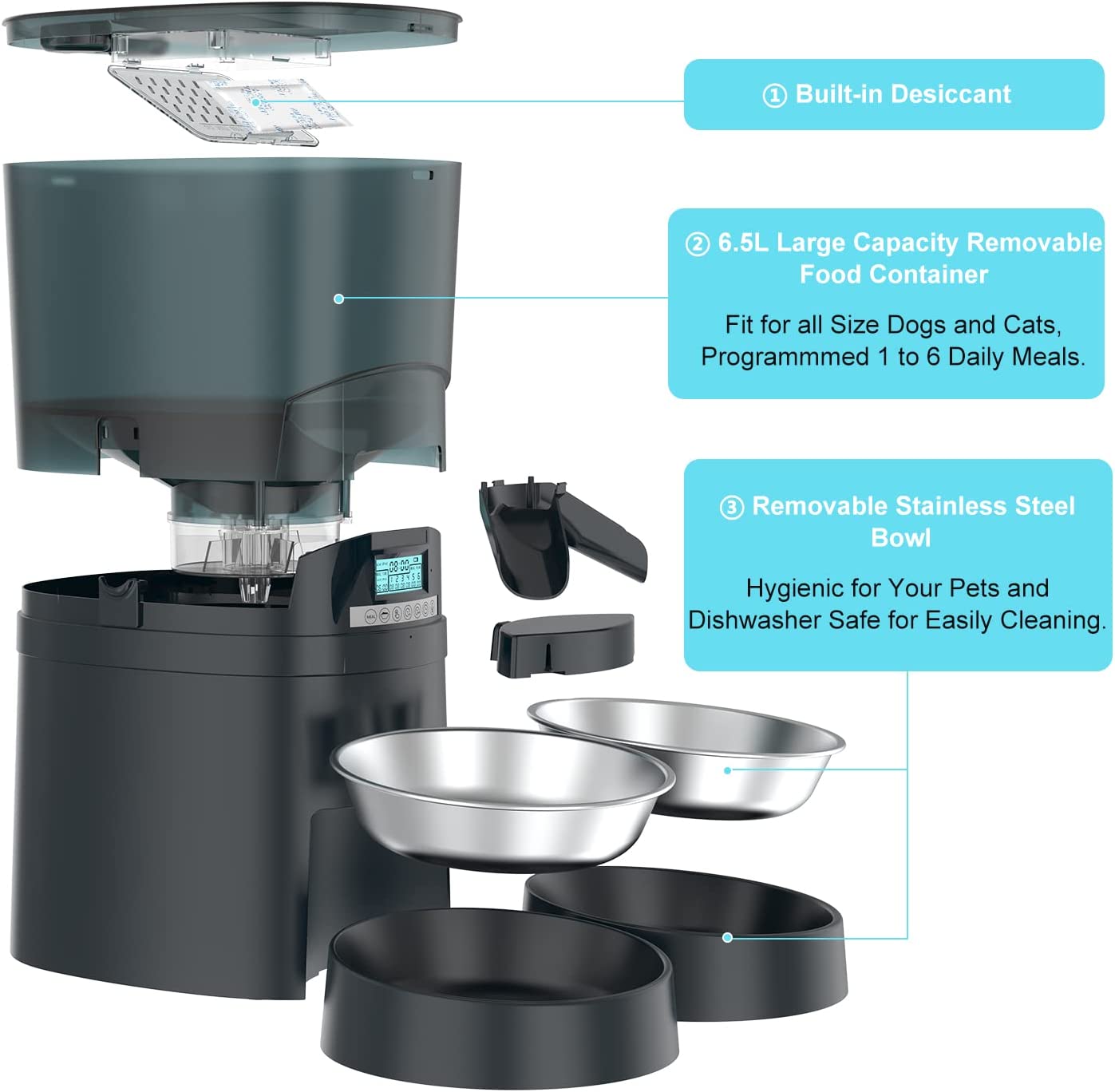 - 【لوحة تشغيل مريحة】لوحة تحكم سهلة الاستخدام، سهلة التركيب. أزرار مضادة للمس لمنع حيوانك الأليف من لمس الطعام وسرقته عن طريق الخطأ، اختيار التغذية اليدوية لإعطاء الحيوان الأليف الطعام وقتما تشاء. يشكل الغطاء العلوي نوعًا من الختم بحيث يظل الطعام طازجًا حتى تتلقى حيواناتك الأليفة الطعام الذي تحتاجه. حاوية طعام قابلة للإزالة ووعاء من الفولاذ المقاوم للصدأ لسهولة التركيب والتنظيف.
