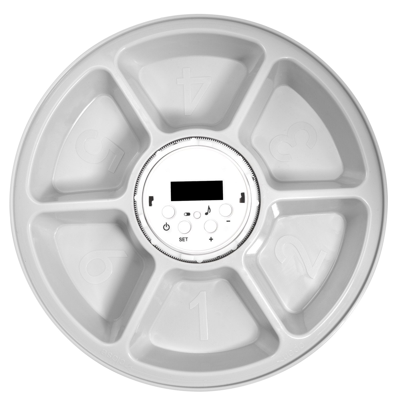 7. تصميم 6 وجبات: قم ببرمجة لوحة LCD وفقًا للإرشادات التفصيلية. يمكنك ضبط 6 أوقات مختلفة و6 وجبات مسبقًا، ووضع 6 أكوام من الحبوب في 6 خلايا بسعة 128 مل لكل منها، ويمكن استخدام الطعام الجاف والرطب.