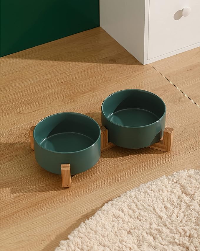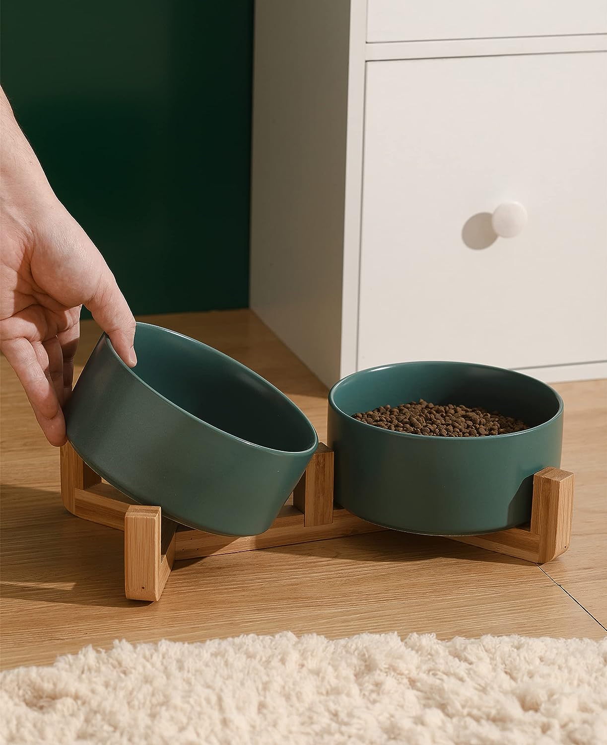 مجموعة أوعية طعام الكلاب المصنوعة من السيراميك مصنوعة من الخزف الخزفي ومادة الخشب الطبيعي، خالية من الرصاص والكادميوم. سيراميك عالي الحرارة، غير سام وغير ضار، ولا رائحة، ومتين. تعقيم نظيف، مفيد لصحة الحيوانات الأليفة.