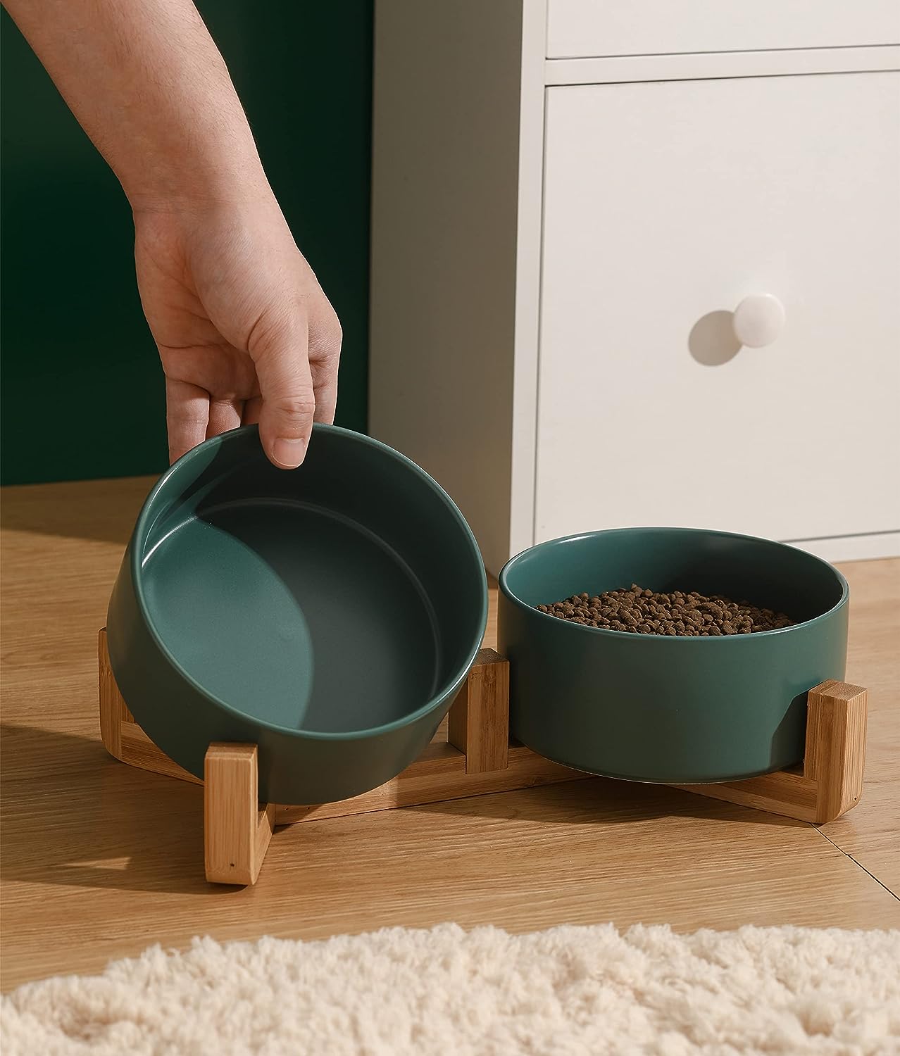 مجموعة أوعية طعام الكلاب المصنوعة من السيراميك مصنوعة من الخزف الخزفي ومادة الخشب الطبيعي، خالية من الرصاص والكادميوم. سيراميك عالي الحرارة، غير سام وغير ضار، ولا رائحة، ومتين. تعقيم نظيف، مفيد لصحة الحيوانات الأليفة.