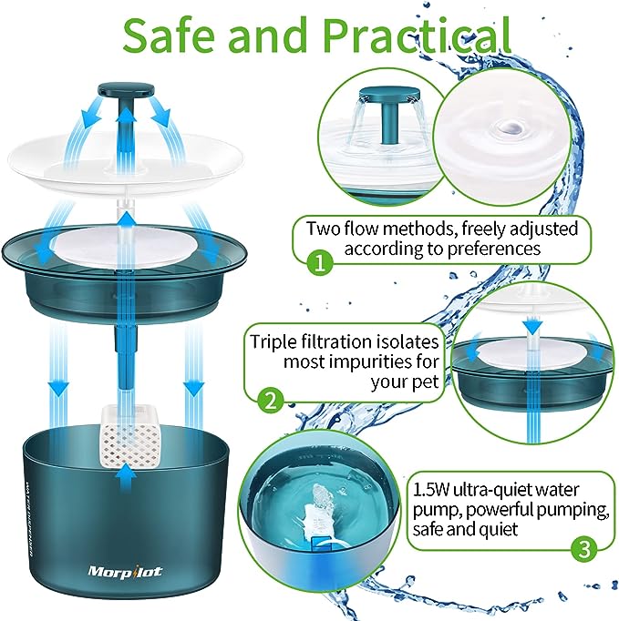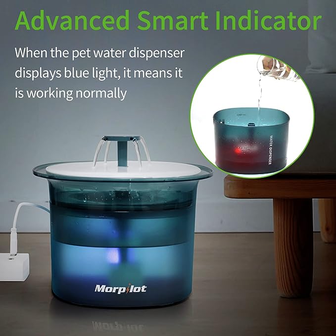 - تصميم المنتج الحميمي: تحتوي نافورة مياه الحيوانات الأليفة Morpilot على وضعين للتدفق، يمكن لوضع الشلال رش تيارات من الماء المناسب للقطط للشرب، بينما وضع النافورة مناسب للكلاب للشرب. في الوقت نفسه، تحتوي النافورة أيضًا على وظيفة مؤشر ضوئي للتذكير بإضافة الماء. عندما يكون مستوى الماء بين أعلى وأدنى مستويات المياه، سيضيء مؤشر الضوء الذكي الموجود على المضخة باللون الأزرق ويعمل بشكل طبيعي. عندما يتحول مؤشر الضوء إلى اللون الأحمر، يرجى إضافة الماء في الوقت المناسب.
