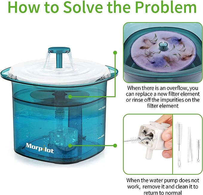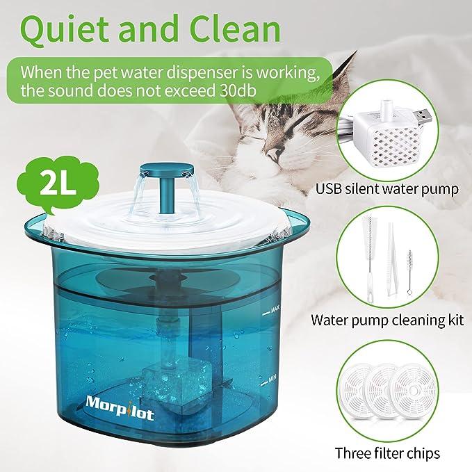 - مضخة مياه فائقة الصمت بمنفذ USB: تتميز مضخة المياه لدينا بتصميم فائق الهدوء، حيث يقل الضوضاء عند العمل عن 30 ديسيبل. قوة 1.5 وات، وعمر خدمة 2500 ساعة، وتصنيف مقاومة الماء IP8 ووظيفة قابلة للفصل، ومجهزة بأداة فرشاة لتنظيف مضخة المياه. نوصي بتنظيف مضخة المياه مرة كل 3-5 أيام. عندما لا تعمل مضخة المياه أو تفيض، قم على الفور بتنظيف مضخة المياه وعنصر الفلتر لاستعادة وضعها الطبيعي.