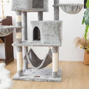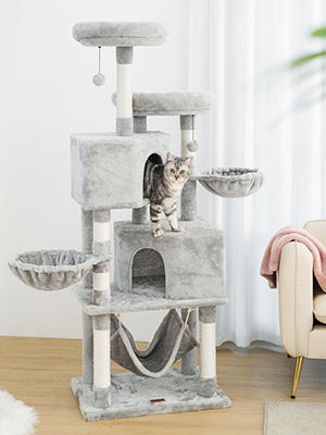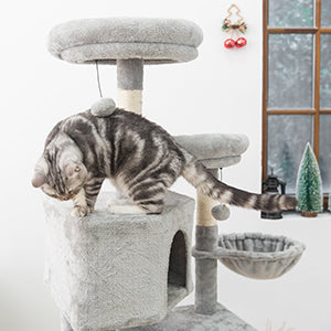 - عندما يحين وقت اللعب، تساعد أعمدة السيزال المغلفة جزئيًا في تعزيز حك الأظافر الصحي وتشجيع قطتك على ممارسة التمارين الرياضية. توجد أيضًا كرات معلقة لقطتك لتضربها حتى تشبع قلبها الفروي!