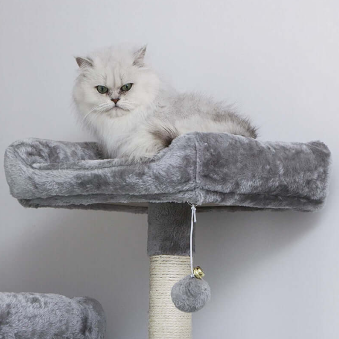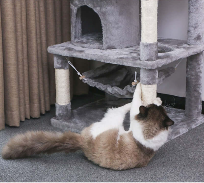 - عندما يحين وقت اللعب، تساعد الأعمدة المغطاة جزئيًا بألياف السيزال في تعزيز حك الأظافر بشكل صحي وتشجيع قطتك على ممارسة الرياضة. توجد أيضًا كرات معلقة لقطتك لتضربها كما يحلو لها!