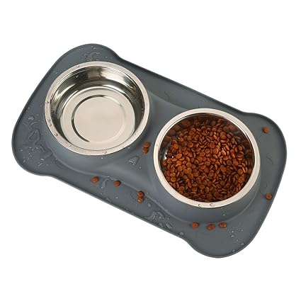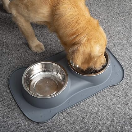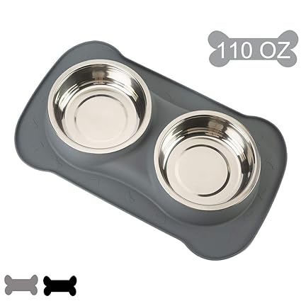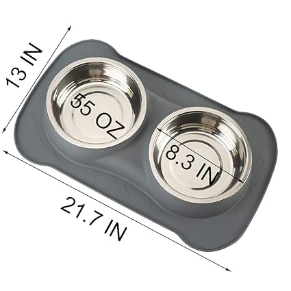- وعاءان كبيران مزدوجان - هذا المنتج مصنوع من السيليكون الآمن غذائيًا ووعاءين من الفولاذ المقاوم للصدأ، خالٍ من مادة البيسفينول أ: ارتفاع الوعاء 2.75 بوصة، القطر 8.3 بوصة، السعة 55 أونصة، حجم حصيرة الطعام هو الطول 22 بوصة * العرض 13 بوصة، جيد للكلاب الكبيرة.