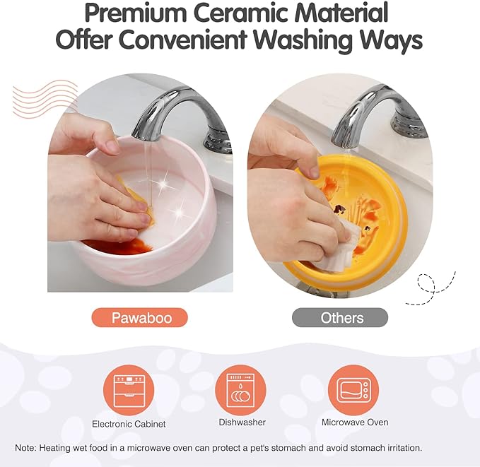 - مواد عالية الجودة - وعاء التغذية مع الحامل مصنوع من سيراميك البورسلين بنسبة 100%، غير سام وغير ضار ولا رائحة له ومتين. حافة الوعاء ناعمة وخالية من النتوءات، مما لن يتلف فم الحيوان الأليف. يمكن غسل الوعاء في غسالة الأطباق أو الميكروويف.