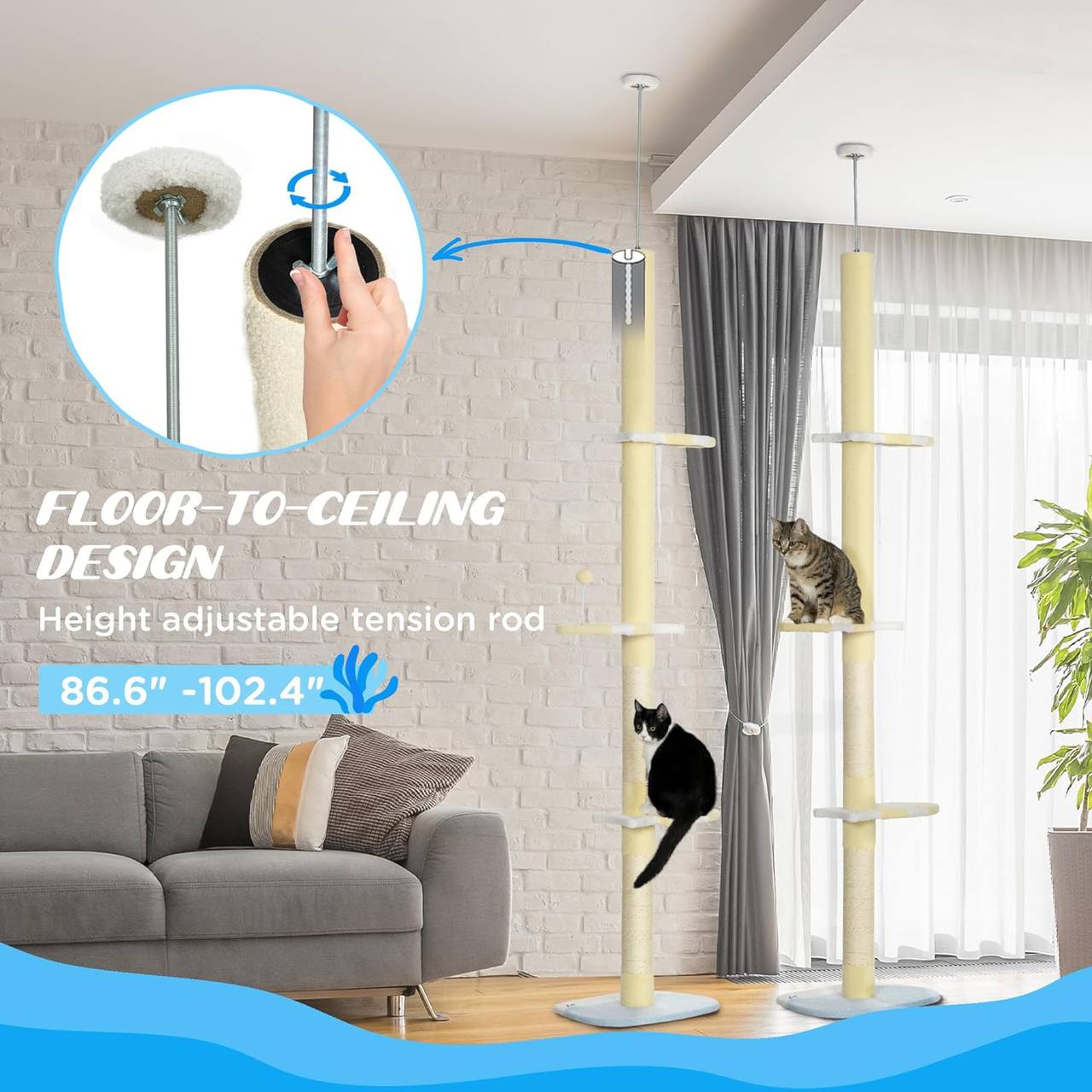 من الأرض إلى السقف: يتراوح ارتفاع شجرة القطط الطويلة هذه من 220 سم. عندما يتم ضغط قضيب الشد بشكل صحيح، فإنه يظل قويًا ومستقرًا. يمكن للقطط القفز والاسترخاء والتسلق بأمان على مجاثم متعددة.