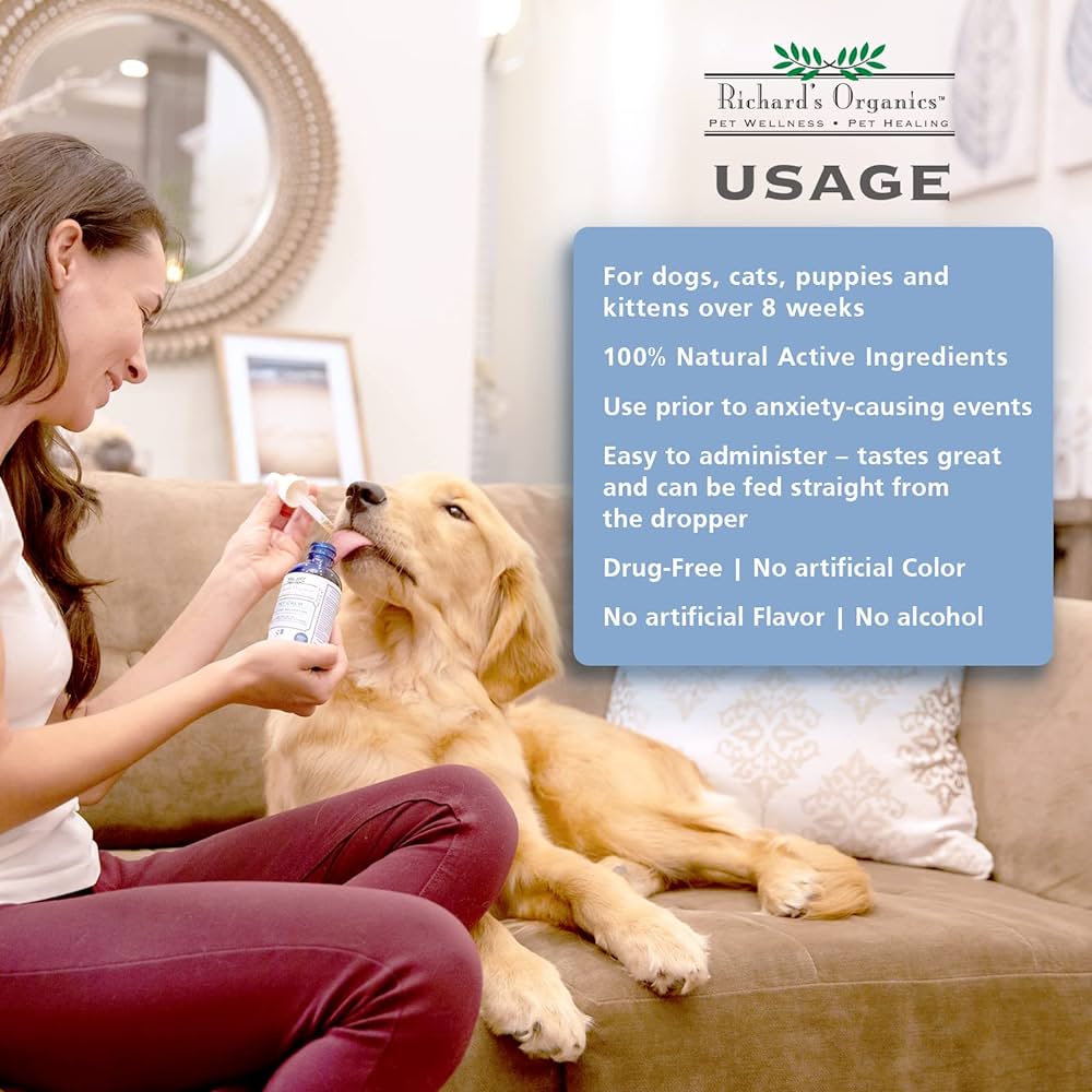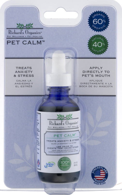 يعالج منتج Richard's Organics Pet Calm القلق والتوتر قصير المدى بفعالية. يستخدم منتج Pet Calm لتهدئة الأعصاب وتقليل فرط النشاط قبل السفر أو العناية بالحيوانات الأليفة أو العطلات أو زيارات الطبيب البيطري أو العواصف الرعدية أو التعريف ببيئات جديدة.
