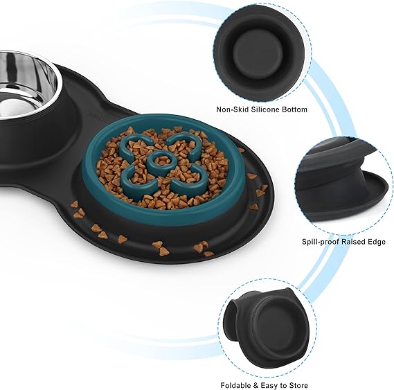 - مجموعة وعاء طعام وماء للكلاب: تصميم عقبة يشبه الزهرة مما يزيد من صعوبة تناول الطعام. يمكنك وضع وعاء أحجية الكلب فوق أحد الأوعية المصنوعة من الفولاذ المقاوم للصدأ والتي تسمح لك بوضع الطعام والماء لحيواناتك الأليفة، كما يمكنك إطعام حيوانين أليفين في نفس الوقت.