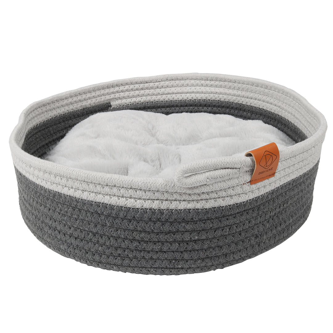 توفر سلة القطط الأصلية هذه من D&D HOME Tailor مكانًا مثاليًا للراحة والاختباء فيه. التصميم المعاصر مصنوع بالكامل من حبل قطني ومريح حقًا لحيوانك الأليف بفضل الوسادة المتوفرة. الوسادة مصنوعة من فراء أرنب صناعي، وهو أنعم حتى من القطيفة العادية. من المؤكد أن هذا سيصبح المكان المفضل لقطتك للاسترخاء. تتميز Tailor ببطانة رمادية وبيضاء ومزينة بعلامة D&D HOME بلون كونياك جميل وحزام للتخزين السهل.