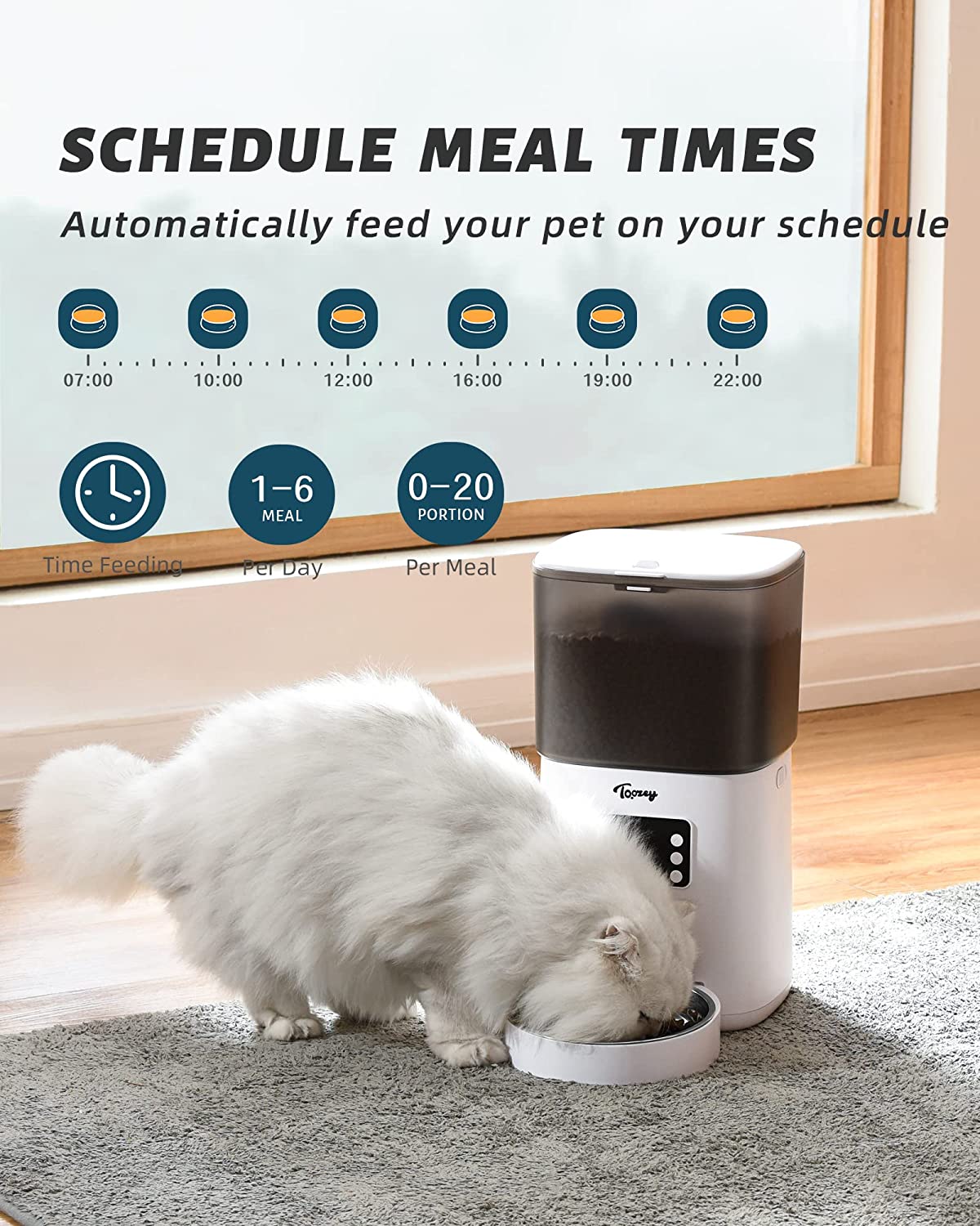 - 🐕لا تفوت وجبة أبدًا - مع مغذيات القطط الأوتوماتيكية Toozey، يمكنك إطعام حيوانك الأليف بشكل موثوق حتى عندما تكون بعيدًا عن المنزل. يمكنك بسهولة إعداد البرنامج المحدد وتخصيص الوجبات اليومية لحيوانك الأليف، من 1 إلى 6 وجبات في اليوم وما يصل إلى 20 حصة (200 جرام / 7 أونصة) لكل وجبة.