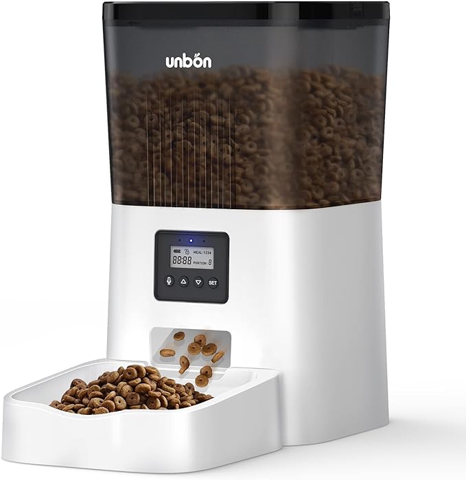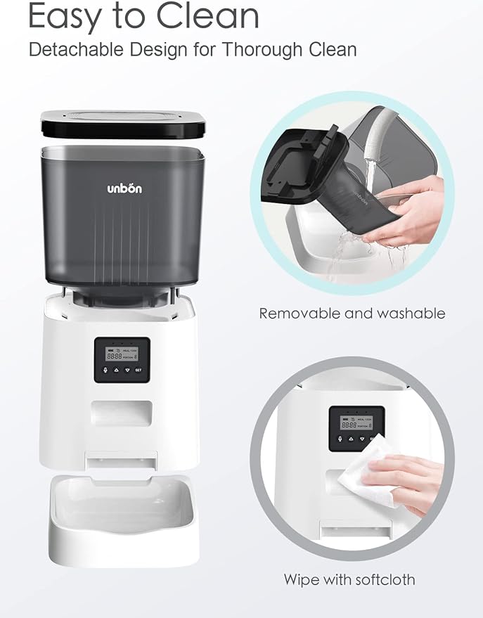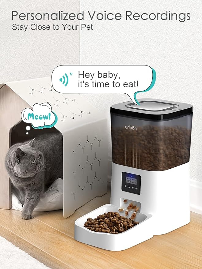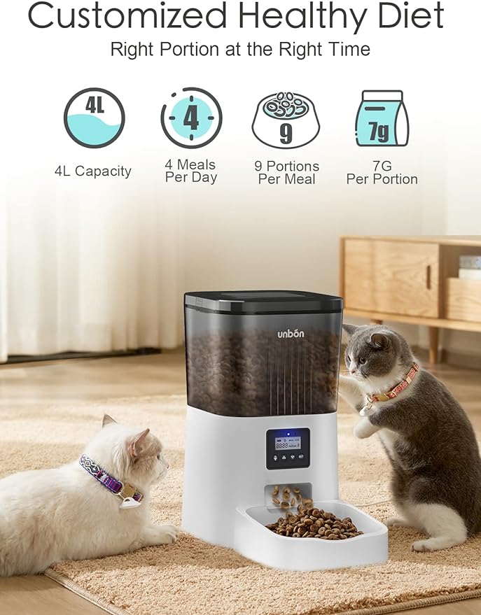 - 【عادي وكمية】 مع لوحة التحكم وشاشة LCD البديهية، من السهل برمجة موزع طعام القطط الأوتوماتيكي UNBON بدقة: 1-4 وجبات في اليوم في ساعات ثابتة بكميات محددة مسبقًا (1-9 حصص لكل وجبة و7 جرام لكل وجبة)، مثالي للتنظيم من خلال مراقبة الطعام وإنشاء نظام غذائي لقطتك. مع موزع طعام القطط القابل للبرمجة هذا، لن توقظك قطتك في الساعة 5 صباحًا بعد الآن