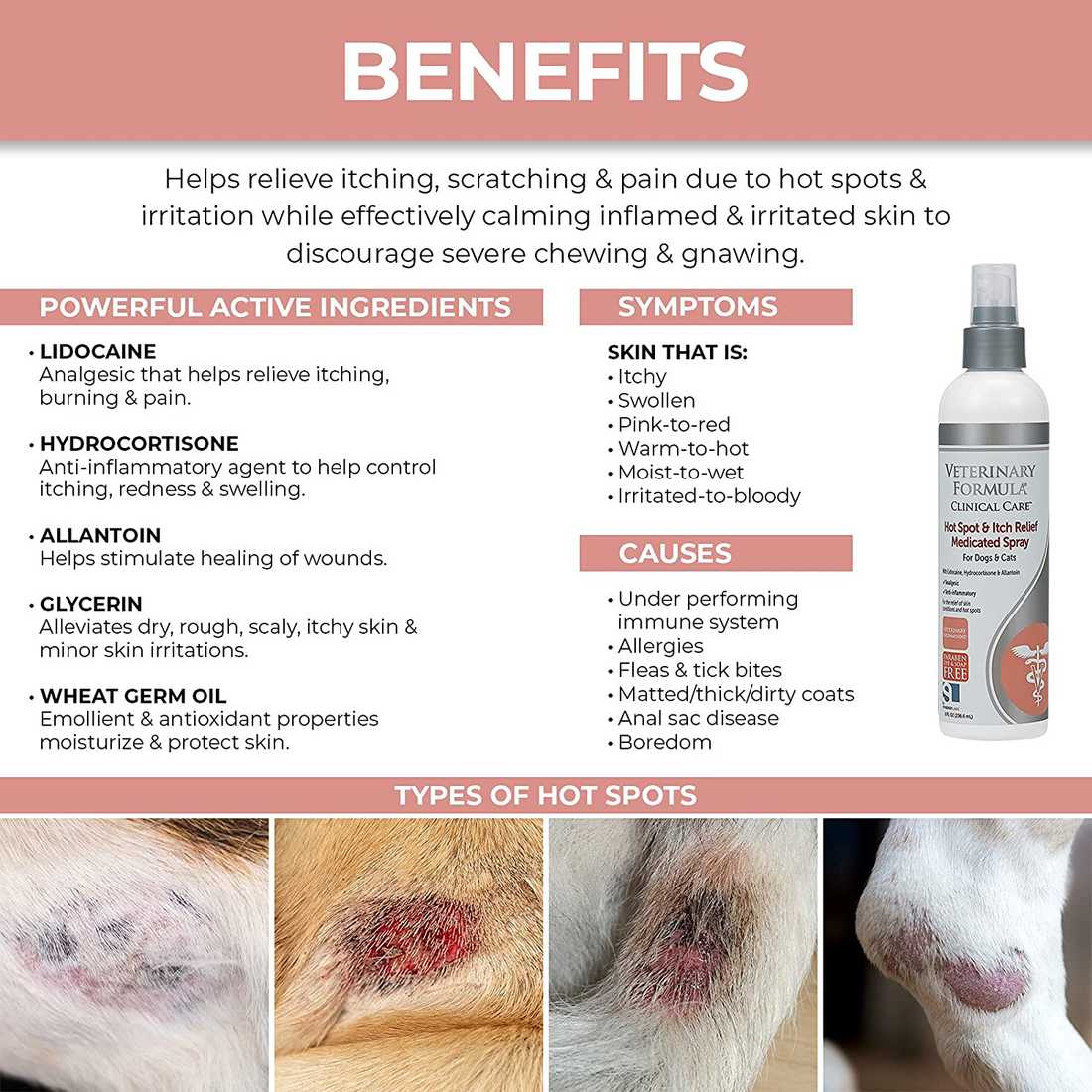 رذاذ مطهر ومضاد للفطريات من Veterinary Formula Clinical Care هو علاج طبي للكلاب والقطط يزيل الروائح الكريهة ويساعد في تخفيف الالتهابات الجلدية الفطرية والبكتيرية الناتجة عن الآتي: