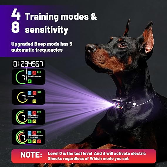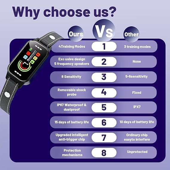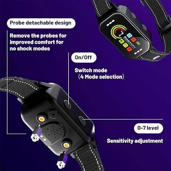 - 🌎【تقنية مطورة، لا مزيد من التحفيز الكاذب】يتميز الطوق بأربعة أوضاع تدريب أمان ذكية بالذكاء الاصطناعي وطوق نباح ذكي للكلاب الصغيرة يعتمد على شريحة متقدمة للتعرف على نباح الكلاب وتقنية اكتشاف الحركة. يتضمن وضع عدم الصدمات مع صفارة واهتزاز وصفارة + اهتزاز؛ ووضع صدمة مع صفارة + اهتزاز + صدمة. مع حساسية قابلة للتعديل تتراوح من 0 إلى 7، تمكن هذه الميزة طوق النباح من تصحيح عادات الكلب السيئة بشكل فعال.