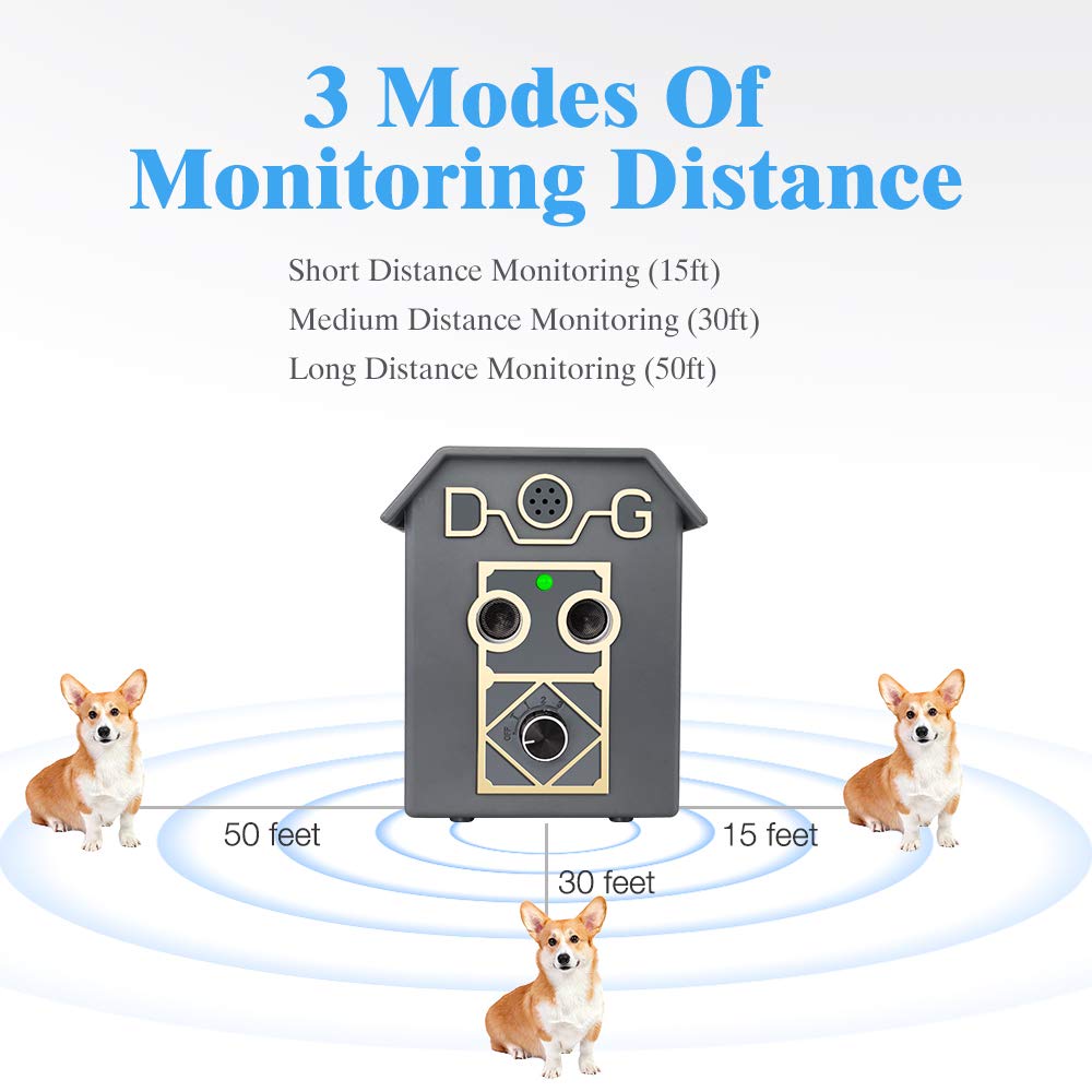 ❣Monitoring distance mode❣ Dog barking deterrent has 4 operation levels, including test mode and 3 range levels. It can automatically detect dog barking range up to 15 feet, medium distance up to 30 feet, and high distance up to 50 feet. It can accurately stop your or your neighbor's dog barking.