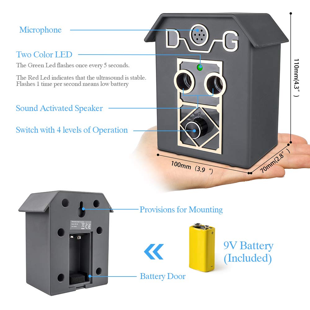 ❣Using status❣ The dog bark stopper has a green LED indicator when it's ready. When it is emitting ultrasonic, the red light is on. When the battery is low, the red LED indicator will flash frequently to remind you that the battery needs to be replaced.