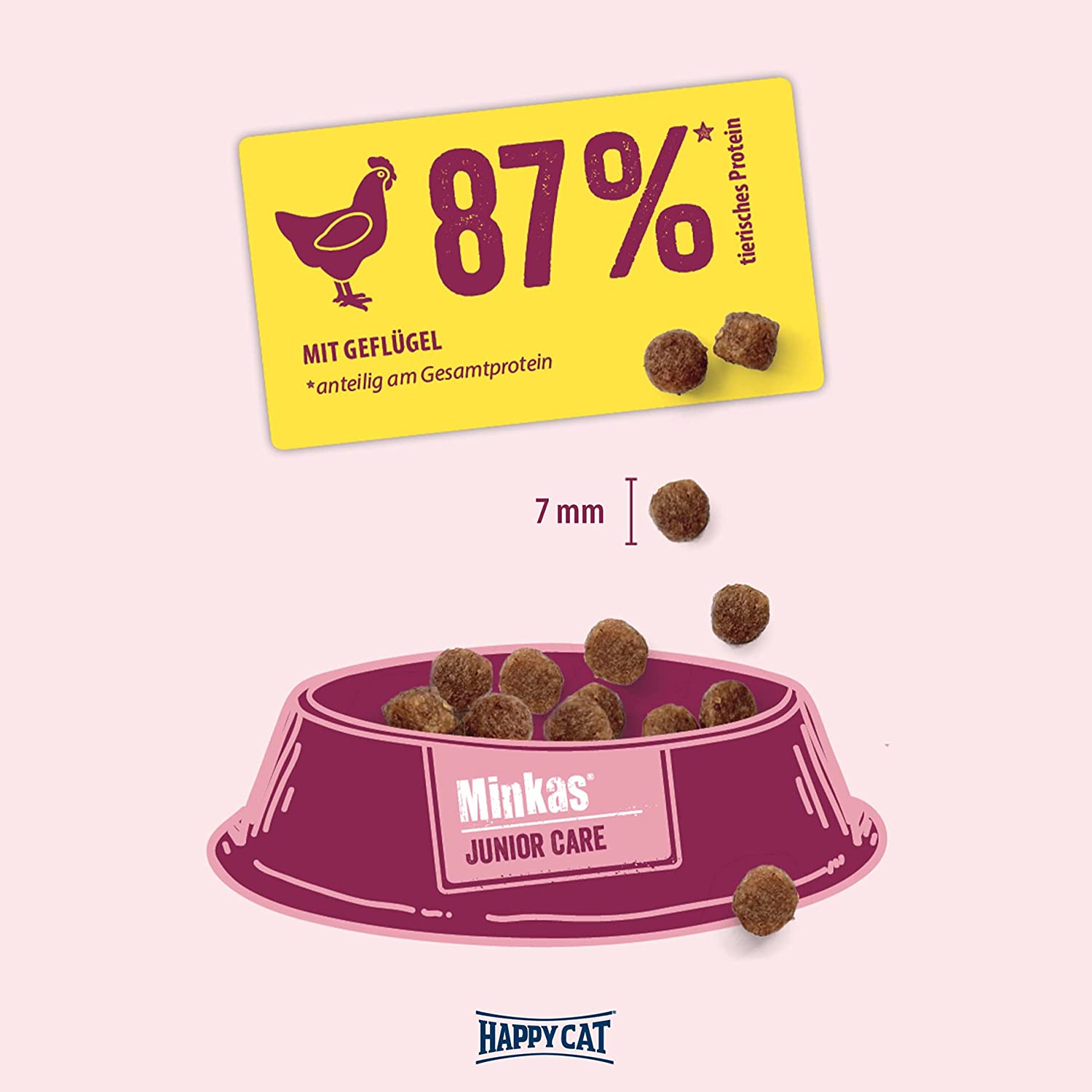 طعام Happy Cat Minkas Junior Care هو طعام ممتاز متكامل لجميع القطط الصغيرة من الأسبوع الثالث عشر من العمر حتى بلوغها مرحلة النضج الجسدي. الحبيبات الصغيرة هي طعام صلب مثالي للنمو الصحي لأسنان القطط الصغيرة. الكمية المثالية من البروتين والدهون تضمن نموًا متناغمًا وبلوغًا سن المراهقة.