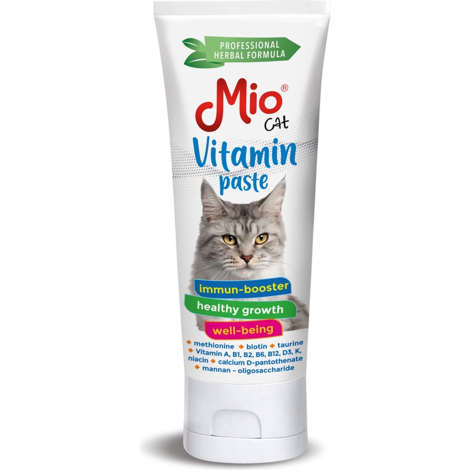 معجون فيتامينات القطط Mio هو علف يحتوي على الفيتامينات والأحماض الأمينية، والتي يكون حاملها هو Mannan-Oligosaccharide (MOS)، والذي يدعم النمو الصحي للقطط.