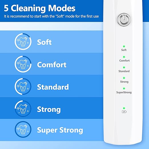 • 【خمسة أوضاع للتنظيف】يحتوي مزيل البلاك للكلاب على خمسة أوضاع عمل: ناعم ومريح وقياسي وقوي وقوي للغاية. يمكنك القيام بذلك وفقًا للحالة الفعلية لأسنان حيوانك الأليف، حيث أن تقنية الموجات فوق الصوتية آمنة للغاية، ولن يكون هناك أي ألم عند استخدام هذه العملية، في المرة الأولى التي تستخدم فيها منظف الأسنان، يرجى اختيار الوضع الناعم.
