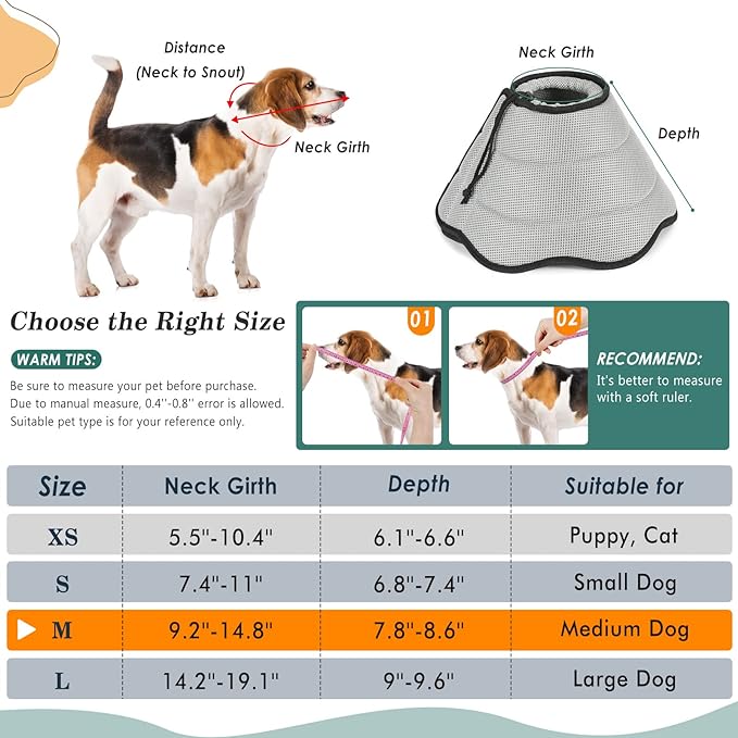 - 【اختر المقاس المناسب】: تتوفر أربعة مقاسات XS/S/M/L للحيوانات الأليفة بأحجام مختلفة. مقاس XS مناسب للقطط والجراء؛ مقاس S مناسب للكلاب الصغيرة؛ مقاس M مناسب للكلاب متوسطة الحجم؛ مقاس L مناسب للكلاب الكبيرة. نصائح: عند قياس محيط الرقبة، استخدم شريطًا ناعمًا للفه بإحكام حول رقبة الكلب، وعند قياس العمق، قم بقياس المسافة من الرقبة إلى الأنف.