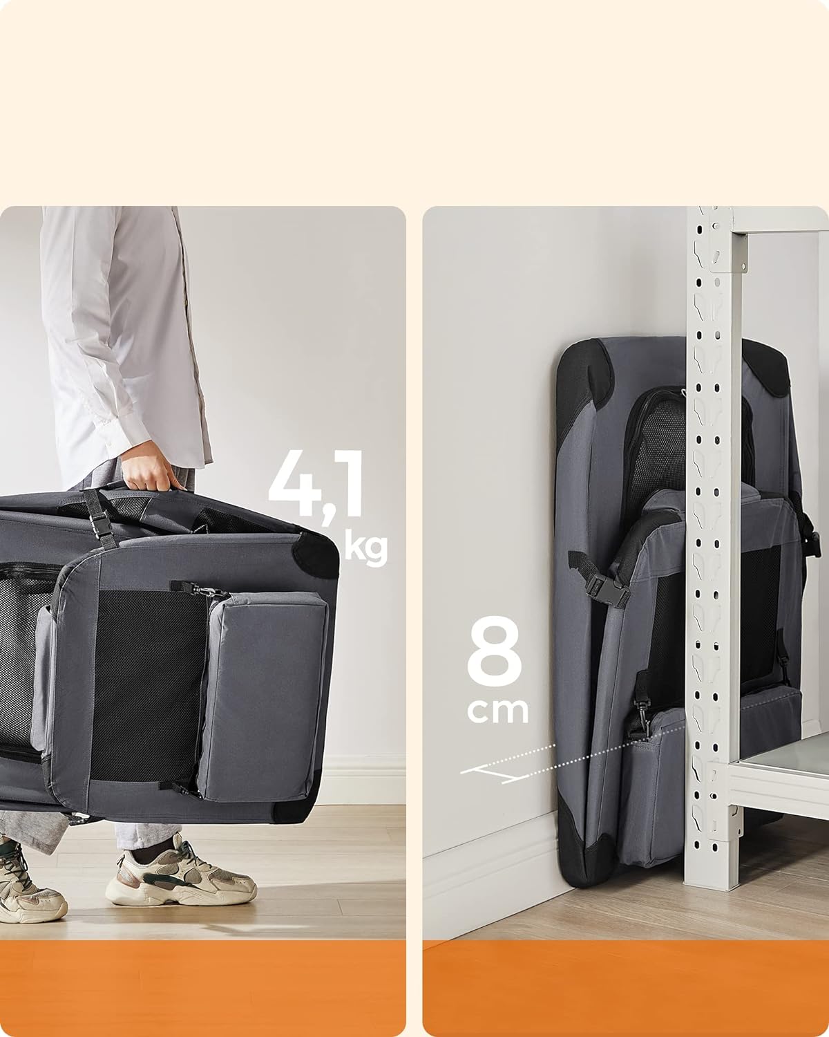 - [محمول وقابل للطي] صندوق نقل القطط سهل النقل بفضل المقابض العملية. قم بطيها بشكل مسطح عندما لا تكون قيد الاستخدام (الحجم المطوي: 81 × 58 × 8 سم) وقم بتخزينها في صندوق السيارة أو في الزاوية