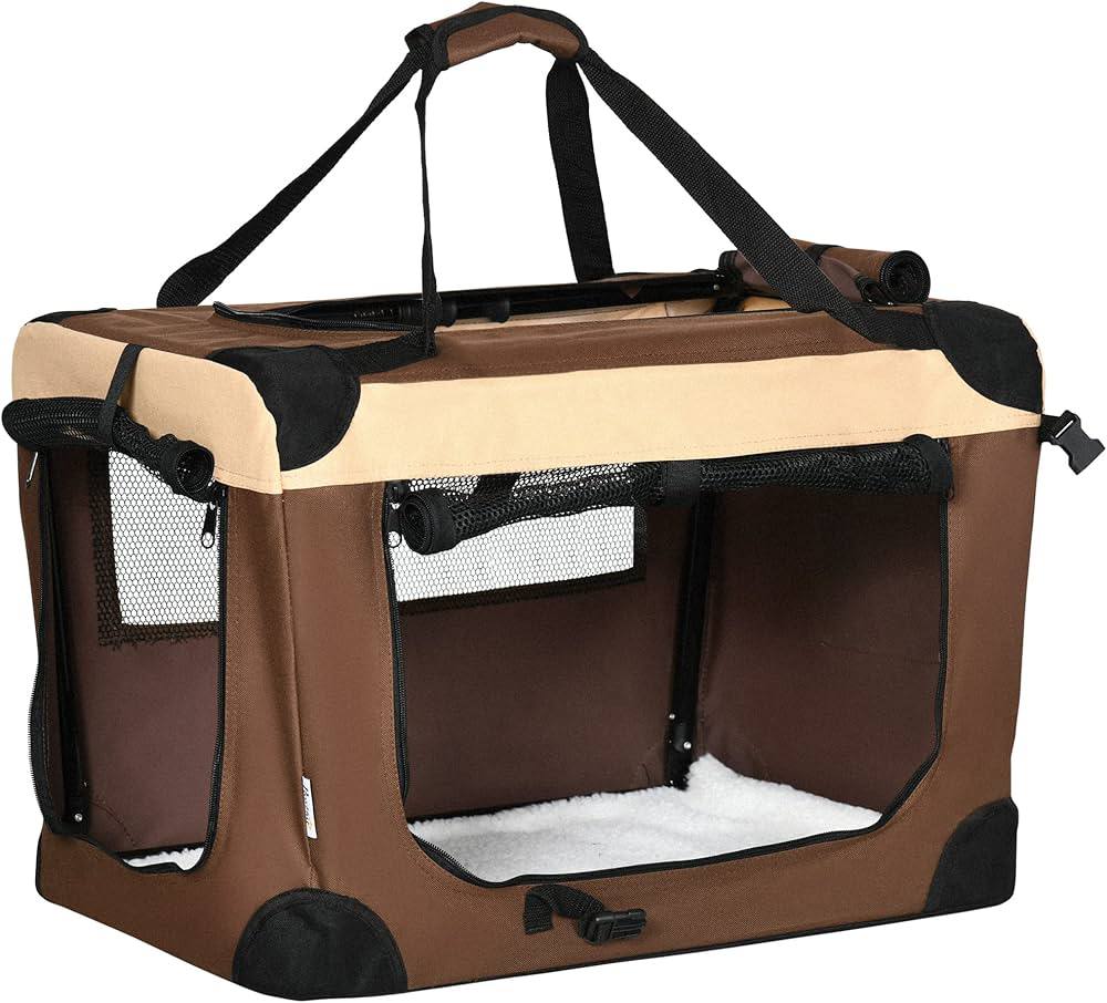 حقيبة حمل الحيوانات الأليفة القابلة للطي من PawHut قفص ناعم محمول للكلاب والقطط والجراء مع أكياس تخزين مبطنة، لون بني، 70 × 51 × 50 سم
