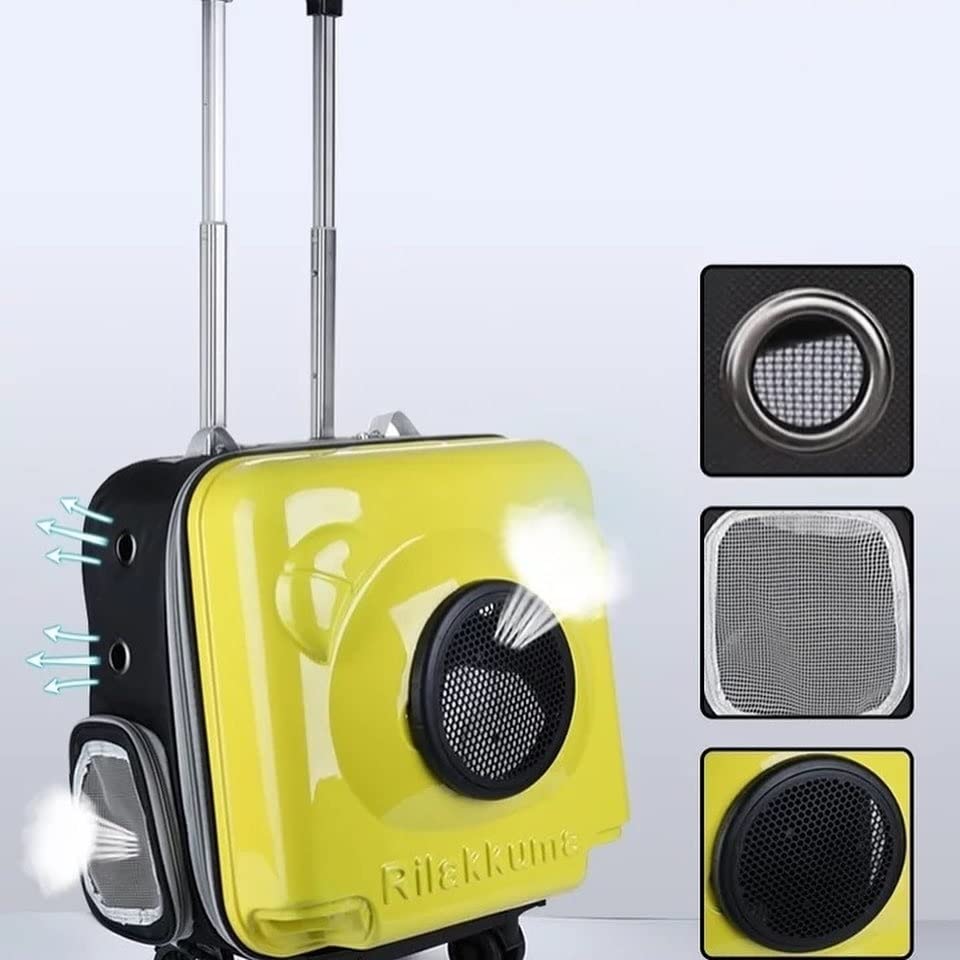 - تحتوي على عجلات ومقبض قابل للتمدد لتسهيل الحركة، بالإضافة إلى ذلك، تم تضمين حصيرة ناعمة توضع على أرضية حقيبة الظهر لراحة الحيوان الأليف.