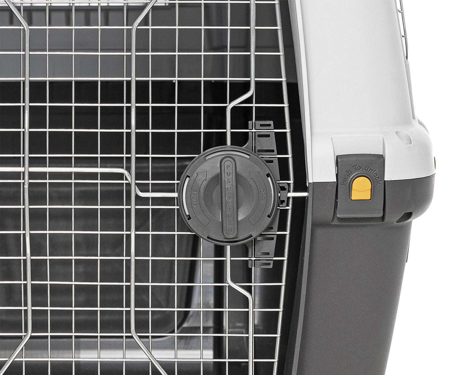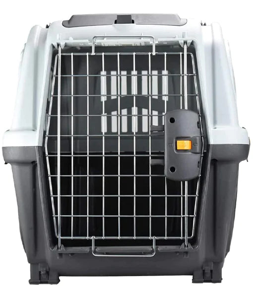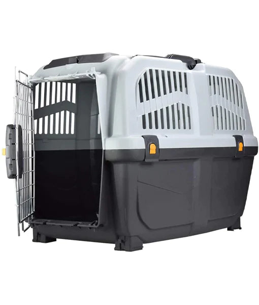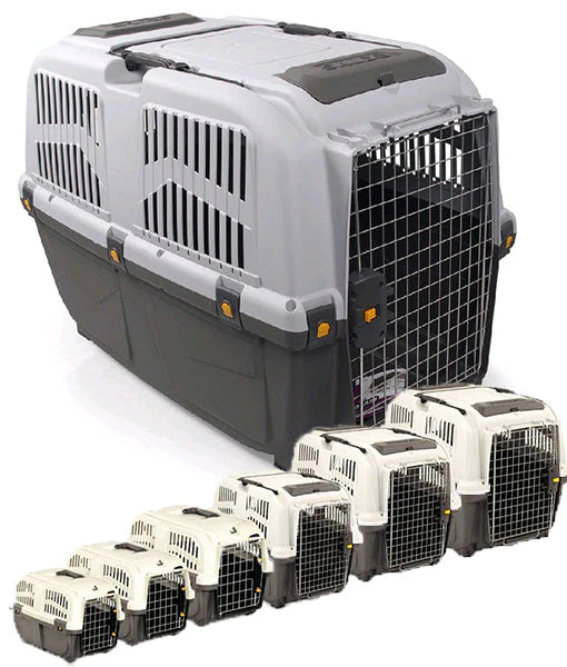 حاملات للكلاب الكبيرة، متوافقة مع معايير النقل الجوي. مزودة بباب معدني مزود بقفل أمان مزدوج التحكم، وحجرة للمستندات/الأغراض ومقبض دوار للإصدار المزود بعربة.
